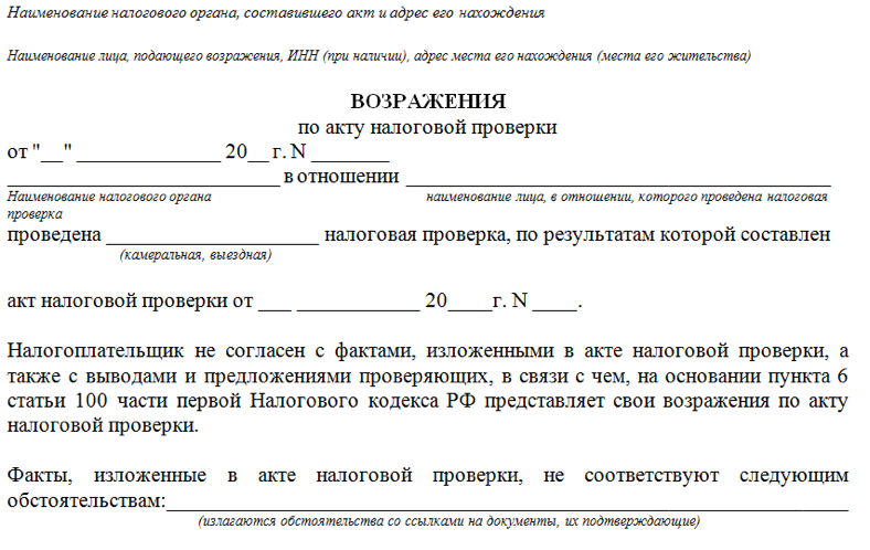 Если у компании есть возражения по содержанию акта, то следует составить их в письменном виде и представить в налоговый орган (п. 6 ст. 100 НК РФ).