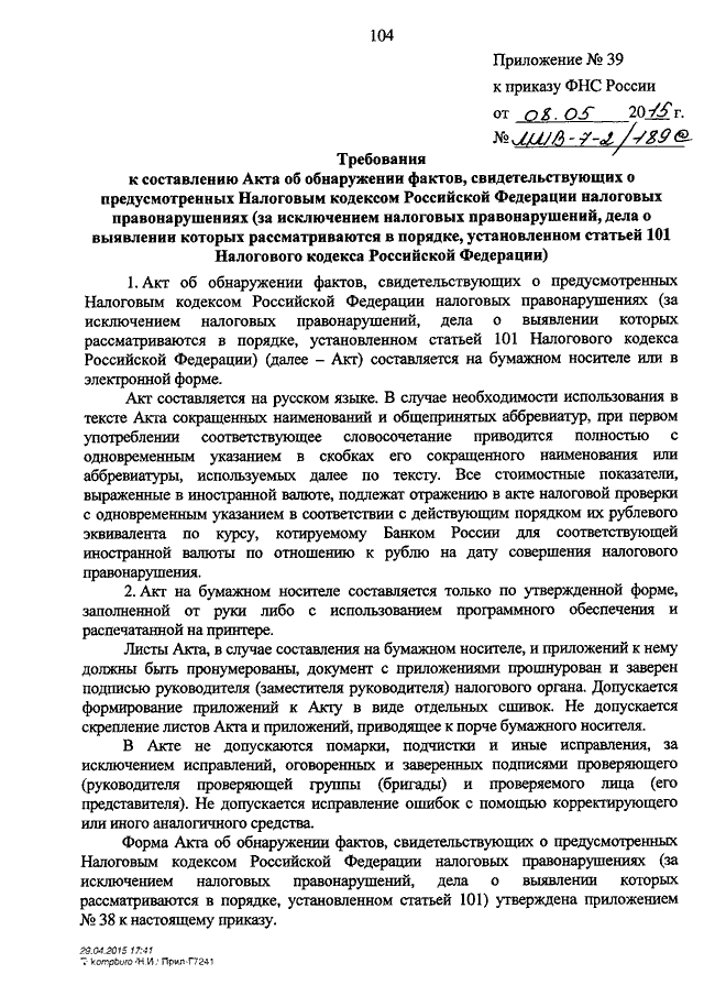 Если компания нарушила законодательство, по результатам проверки ИФНС составит акт по форме, утвержденной приказом ФНС от 08.05.2015 №ММВ-7-2/189 (п. 5 ст. 88, п. 1 ст. 100 НК РФ). Сделать это инспекция должна не позднее 10 рабочих дней после окончания проверки (п.