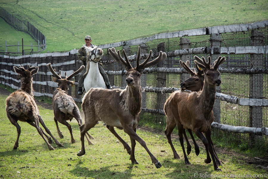 Согласитесь, это довольно экзотическое зрелище, особенно разделка, когда маралов загоняют в загон и их молодые рога перерезают вручную, после чего их кровь на месте впитывают туземцы.