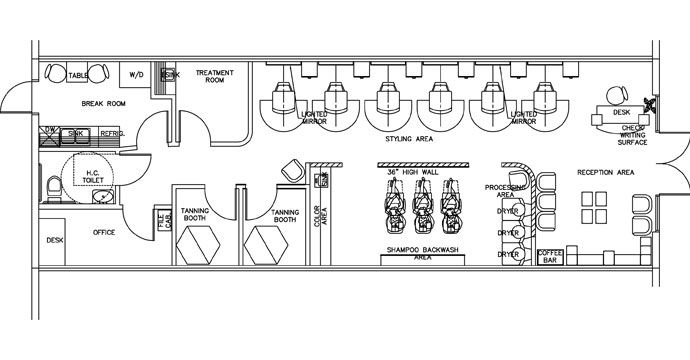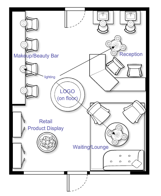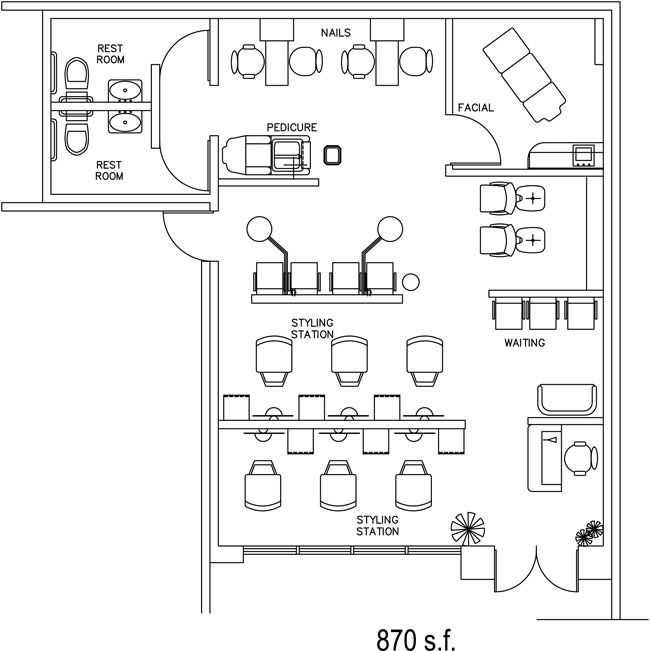 Обычно посещения салонов красоты планируются клиентами заранее, и осуществляется бронь на удобное для клиента время. Стандартная планировка включает в себя отдельные помещения для парикмахерских услуг, массажа, маникюра и педикюра, косметических услуг, рецепцию, а также служебные помещения.