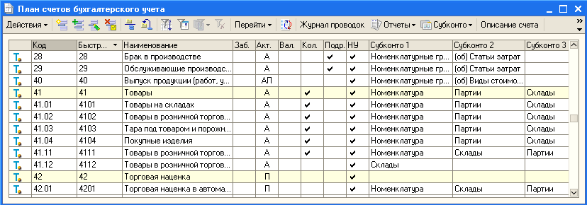 Счет 41 «Товары» имеет следующие субсчета: