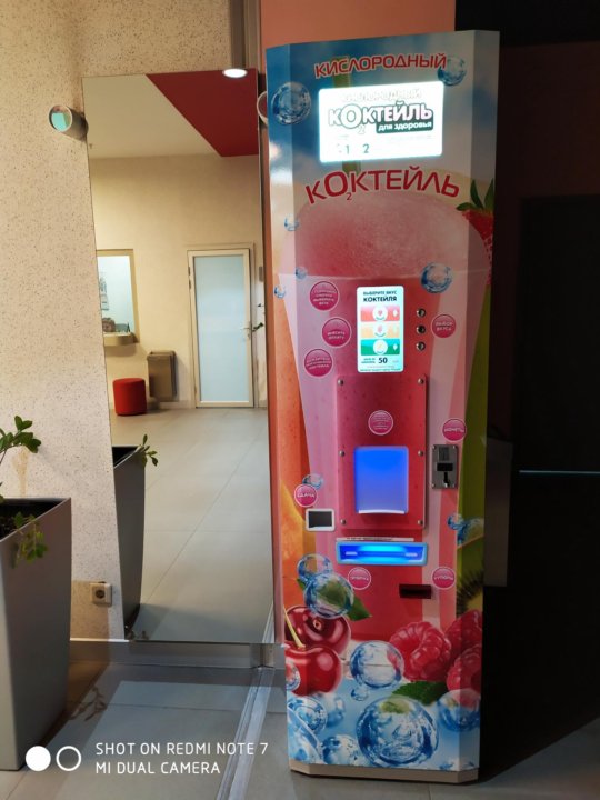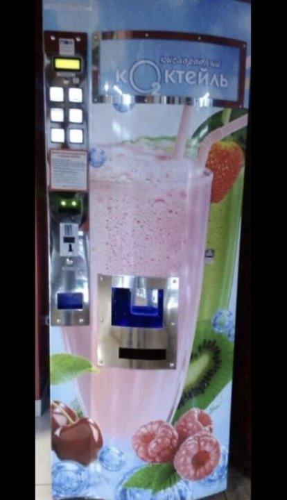 Вендинговый аппарат по производству и продаже молочных и кислородных коктейлей. Характеристики: производительность, л/ч 60 порций коктейля, количество напитков 6 вида кислородного коктейля (25 разных вкусов), монетоприемник, количество стаканов — 0,4 л 300 шт, потребляемая электроэнергия 220 В; 0,4 кВт/ч, габариты 700*600*1850, масса 90 кг.