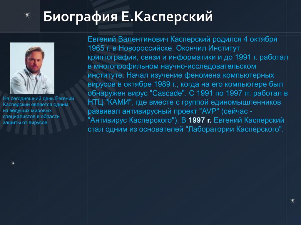 Основатель, руководитель антивирусных исследований и генеральный директор «Лаборатории Касперского».
