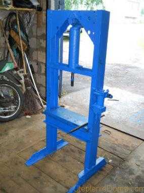 Оптимальный вариант – использовать в качестве пресса автомобильный гидравлический домкрат. Их грузоподъёмность бывает разной, минимум 2 тонны. Нужно подготовить прочную металлическую рамку, к верхней балке корой крепится домкрат (вверх ногами). То есть усилие домкрата будет направлено вниз, где находится форма, заполненная сырьем.