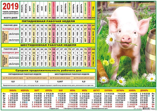 В производственном календаре на 2019 год приведена норма рабочего времени на месяцы, кварталы и 2019 год в целом при 40-, 36- и 24-часовых рабочих неделях, а также количество рабочих и выходных дней при пятидневной рабочей неделе с двумя выходными днями.