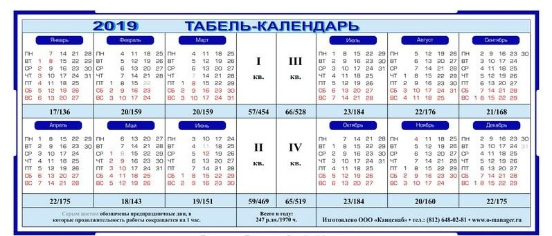 В 2019 году 247 рабочих дней, в том числе 6 рабочих дней сокращены на один час.