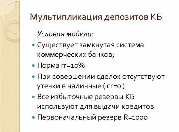 Для наглядности и упрощения модели мультипликации введем ряд допущений: коммерческие банки не хранят избыточные резервы, а используют их для выдачи займов своим клиентам; все коммерческие банки выдают кредита на всю величину своих избыточных резервов; средства, находящиеся на депозитных счетах в коммерческих банках, не обращаются в наличность и не остаются на руках клиентов; выданные в займ средства зачисляются на текущие (расчетные) счета кредиторов; все средства, выданные в ссуду одним банком, в процессе их расходования кредиторами перечисляются на депозитные счета в другом банке и хранятся там, увеличивая его избыточные резервы.
