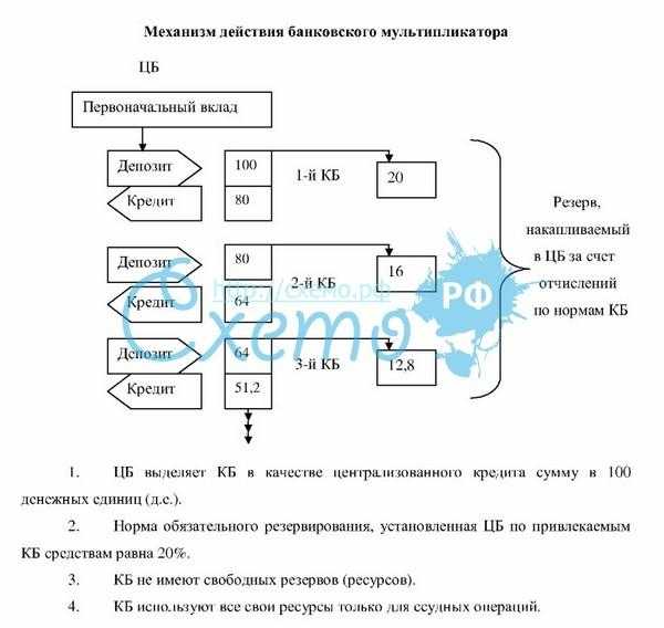 Как отмечалось ранее, ЦБ использует для регулирования объема денежного агрегата в экономике механизм обязательного резервирования. Допустим, норма обязательных резервов установлена в размере 10 %.