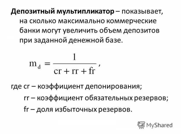 Банковский (депозитный) мультипликатор — коэффициент, показывающий, во сколько раз возрастет общий объем депозитов в банковской системе при увеличении избыточных резервов коммерческих банков.