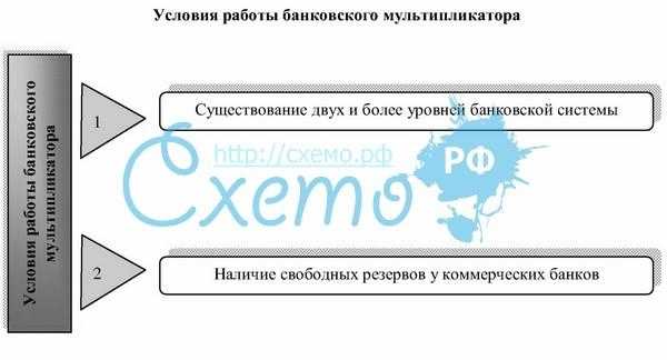 Механизм банковского мультипликатора может существовать только в условиях двухуровневых (и более) банковских систем, причем первый уровень — центрбанк — управляет этим механизмом, второй уровень — коммерческий — банк заставляет его действовать, причем действовать автоматически независимо от желания специалистов отдельных банков. Механизм банковского мультипликатора непосредственно связан со свободным резервом.