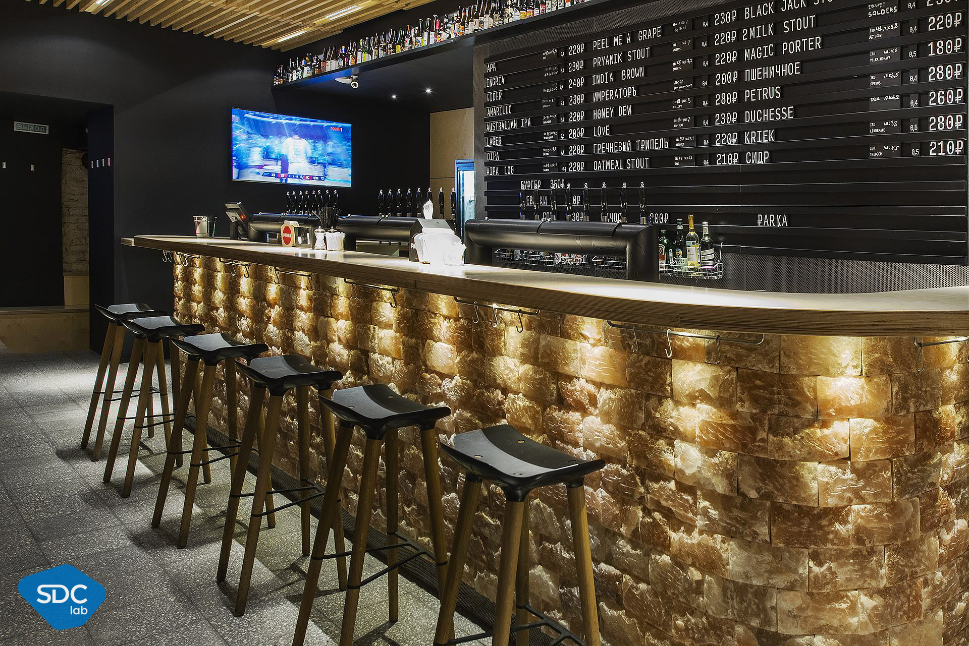 Еще одна важная часть дизайна бара — это барная стойка, которую можно рассматривать как центральную часть вашего бара. Барные стойки обычно изготавливаются из стекла, камня или дерева, но имейте в виду, что у каждого материала есть свои недостатки и преимущества.