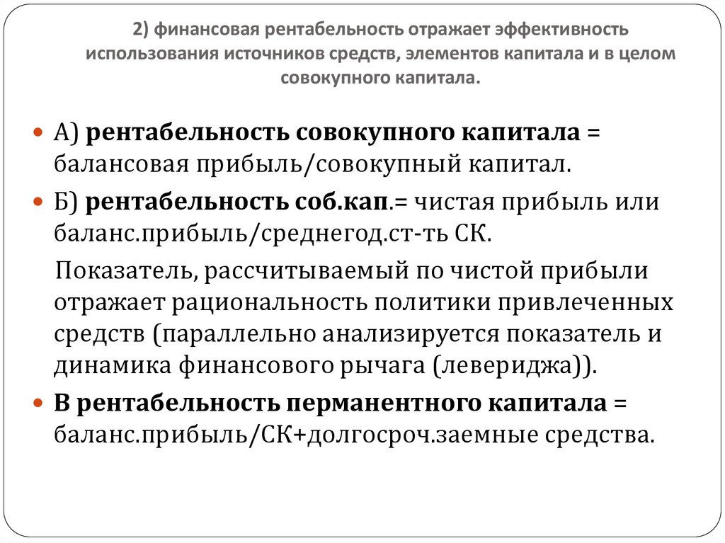 - Рентабельность капитала собственников, вложенного в деятельность фирмы