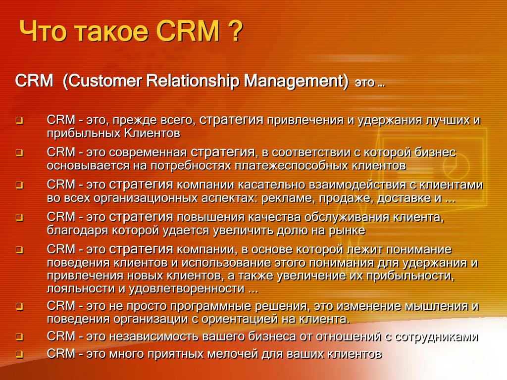 - CRM — это больше, чем просто технология. При успешном внедрении CRM помогает улучшить отношения с клиентами, увеличить доход компании и улучшить качество обслуживания клиентов.