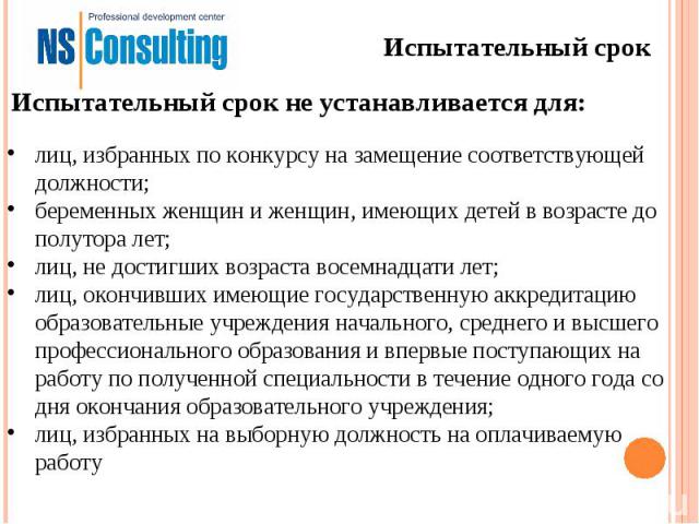 Для кого испытательный срок не устанавливается?В той же статье 70 ТК РФ перечисляются категории лиц, которым не устанавливается испытание при приеме на работу: