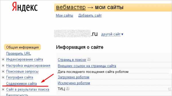 В появившемся списке выбираем нужный. На открывшейся странице есть меню, расположенное в левой части окна. В нем необходимо выбрать «содержимое сайта».