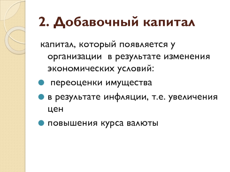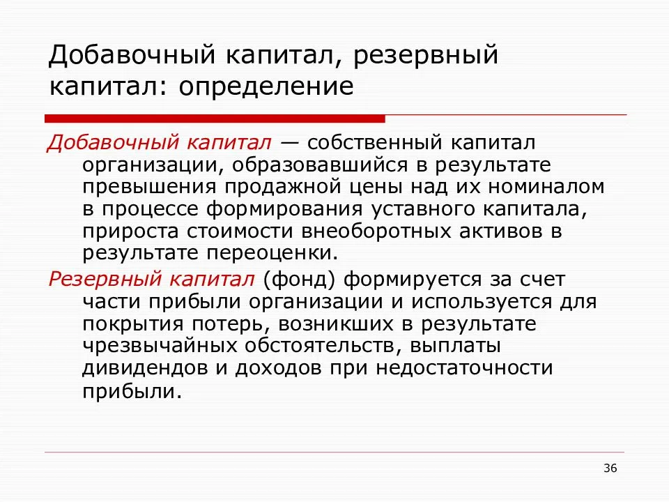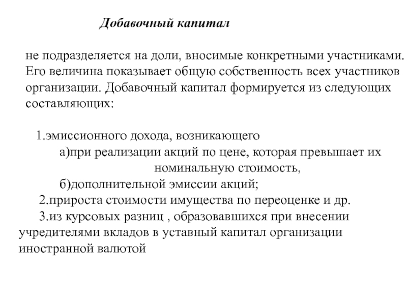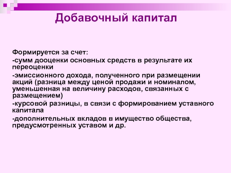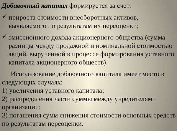 - эмиссионного дохода — сумма разницы между продажной и номинальной стоимостью акций (долей), вырученную при формировании уставного капитала организации (при учреждении организации, при последующем увеличении уставного капитала) за счет продажи акций (долей) по цене, превышающей номинальную стоимость;
