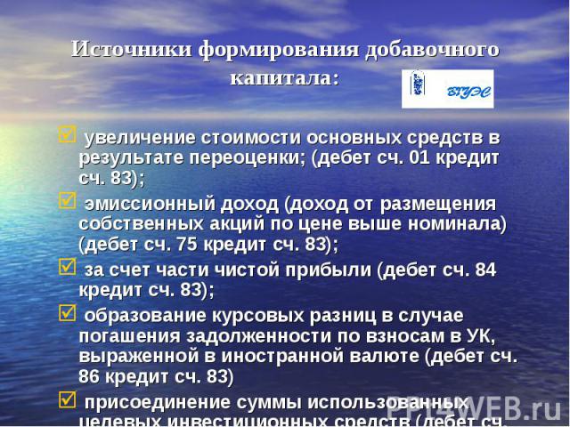 Аналитический учет по счету 83 «Добавочный капитал» организуется таким образом, чтобы обеспечить формирование информации по источникам образования и направлениям использования средств.