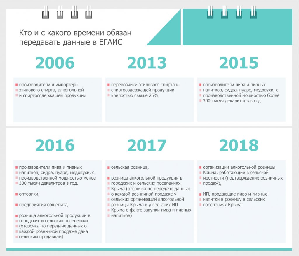 Подробный перечень видов деятельности, характер передаваемой в ЕГАИС информации, а также сроки вступления в силу отдельных обязательств размещены на официальном сайте Росалкогольрегулирования.