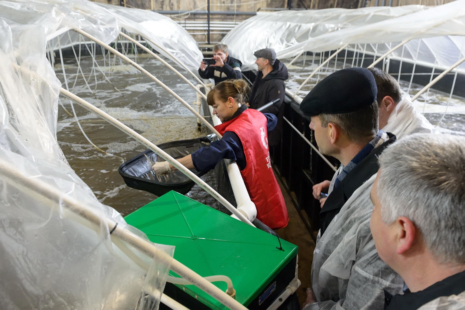 Инкубаторы и резервуары со взрослыми особями оснащены замкнутыми системами биофильтрации (УЗВ). Вода фильтруется постоянно, и без перебоев очищенная жидкость поступает непосредственно в бассейны.