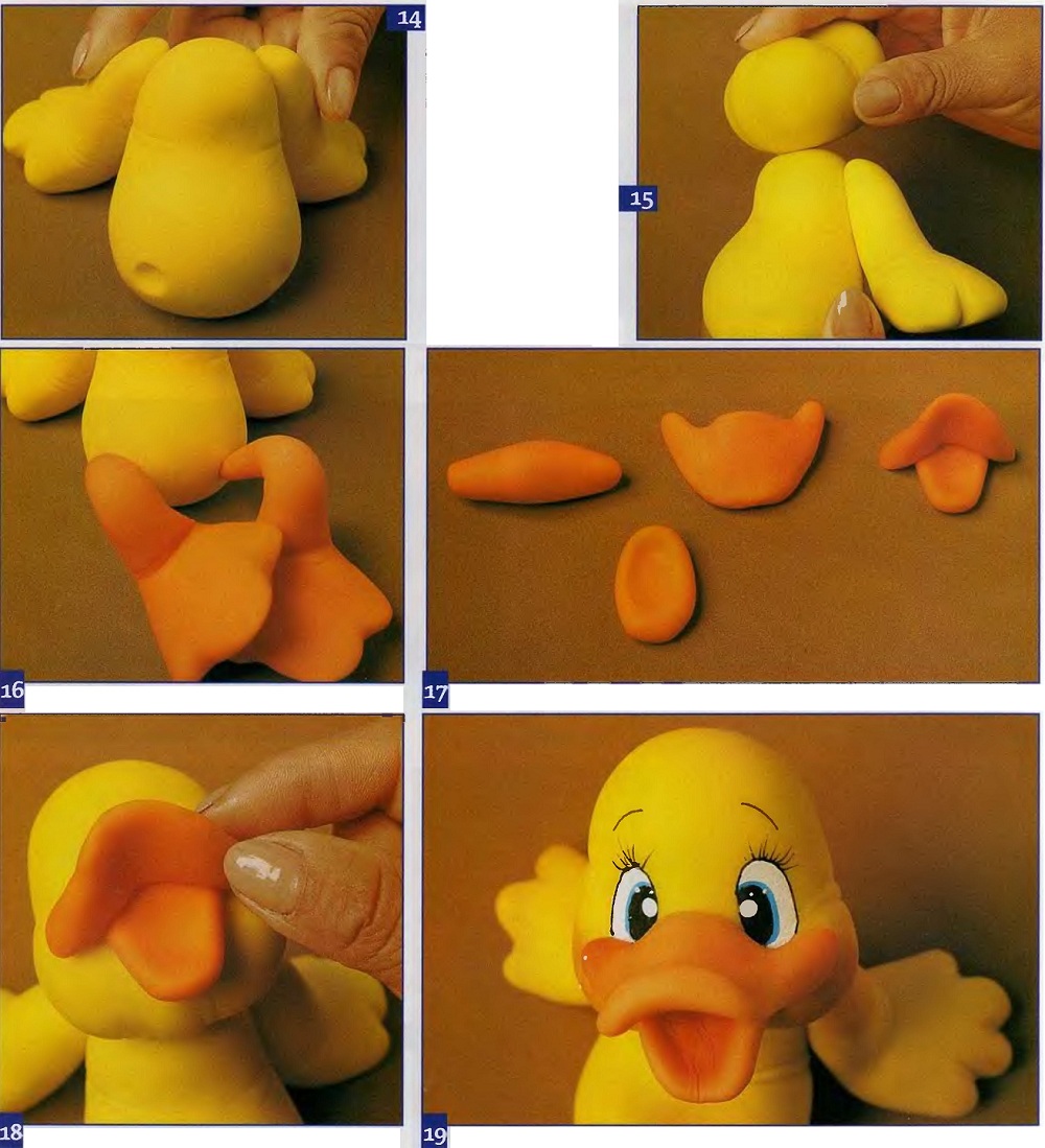 - Остальное — это детализация. Сначала мы начали с создания ушей из желтой глины, свернутой и доведенной до точки наверху. Затем мы добавили на кончик небольшой кусочек черного цвета.