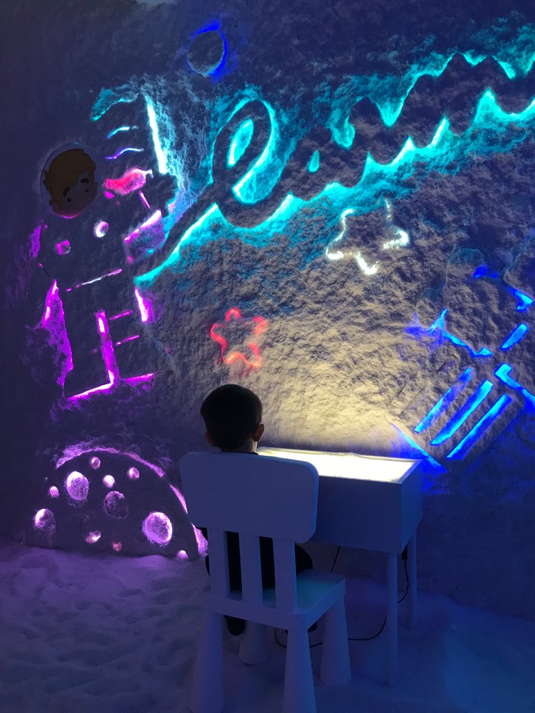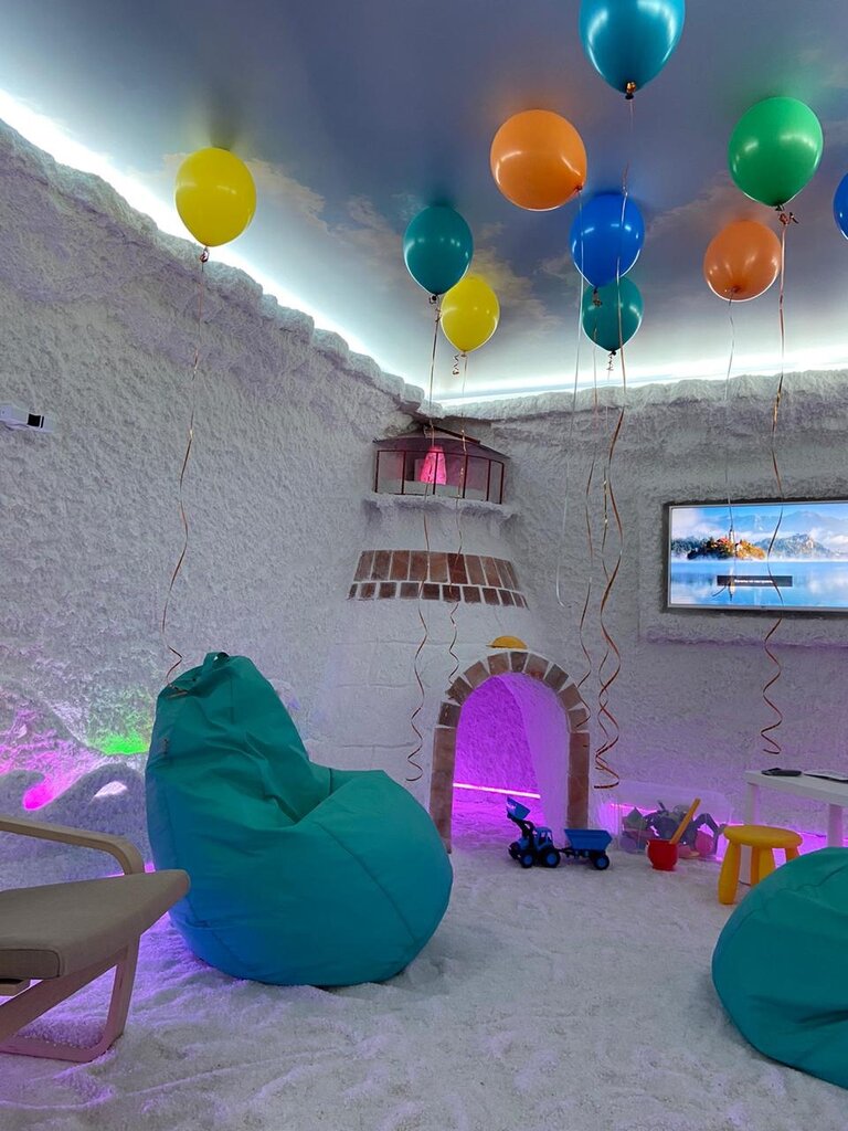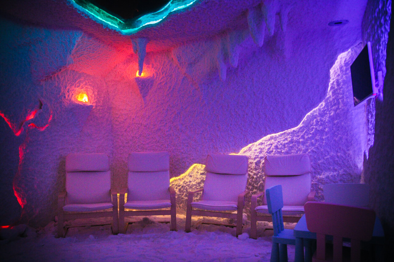 Клиника «Соль Земли» включает в себя детскую, взрослую и отдельную палаты.Детская комната укомплектована массажными креслами для взрослых, детскими креслами, телевизором и игрушками. Пол завален солью, которой, как мне сказали, дети играют, как песком. Дети не знают, что они делают что-то полезное для своего здоровья, они просто играют, прикасаясь к соли, которая полезна для их кожи, а также вдыхают соленый воздух.