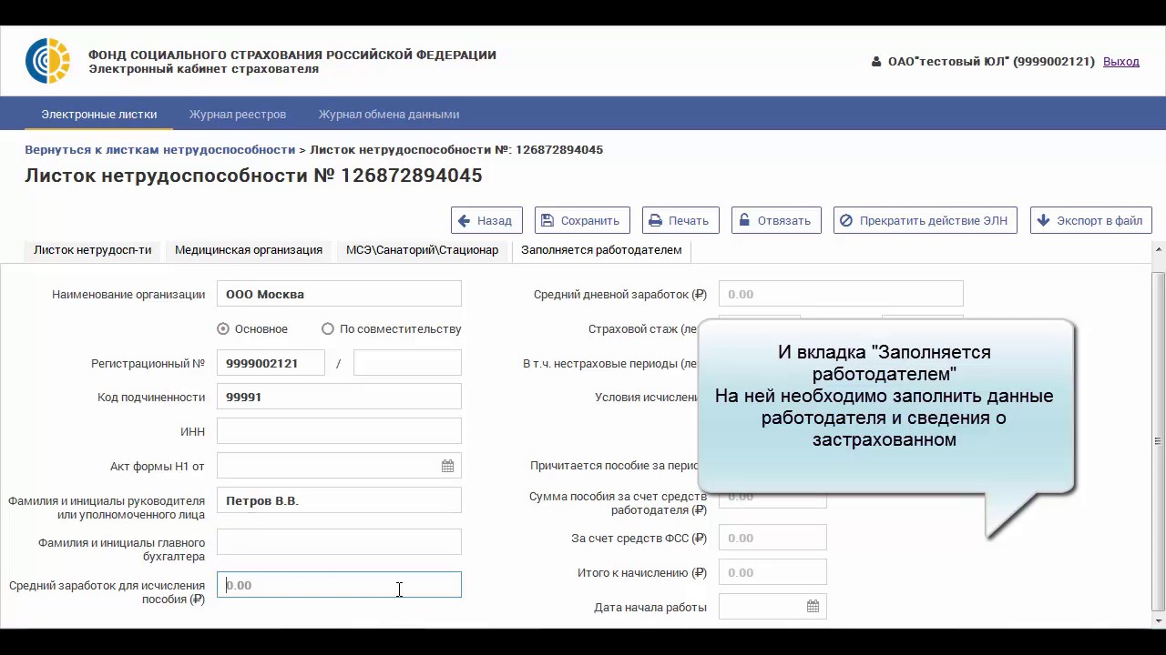 После того как сотрудник принесёт вам номер больничного листа, вы можете либо зайти в личный кабинет юридического лица на сайте ФСС, либо запросить этот больничный лист из фонда по его номеру с помощью своей программы. Далее вы заполняете в больничном листе необходимые данные (ФОТ, стаж) и оправляете его обратно в ФСС. После этого больничный лист будет закреплён за вашей организацией, и никто кроме вас не сможет вносить в него правки.