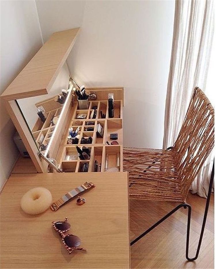 Посмотрите на стены, чтобы найти идеи для спален для маленьких комнат. Повесив шкаф на стену вместо прикроватной тумбочки на полу, вы мгновенно освободите место. Один с выпадающим столом даст вам место, где можно посидеть и сделать макияж или поставить утренний кофе.