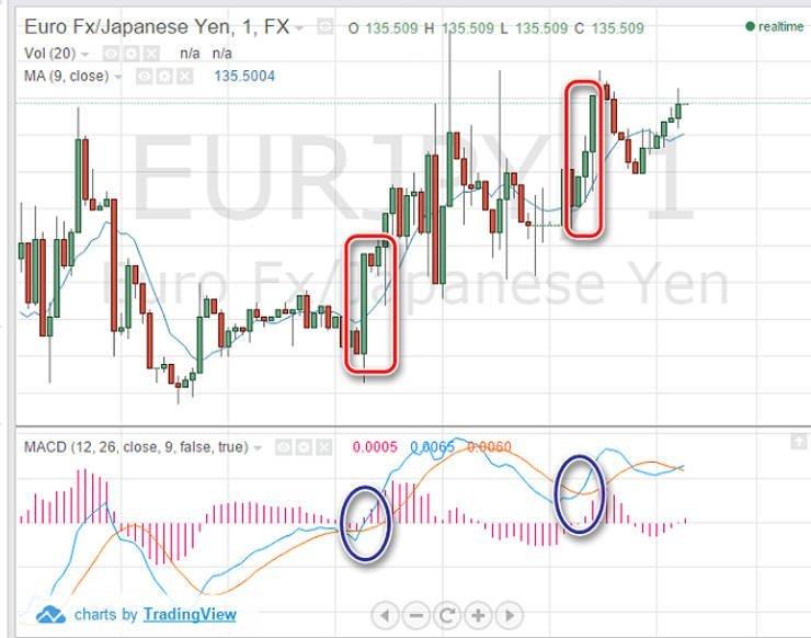 Так как используются скользящие средние, то для такой торговли бинарными опционами требуется участок явного тренда, на который указывает «длинная» линия индикатора EMA. Точкой входа будет пересечение средних с соответствующим положением гистограммы MACD.