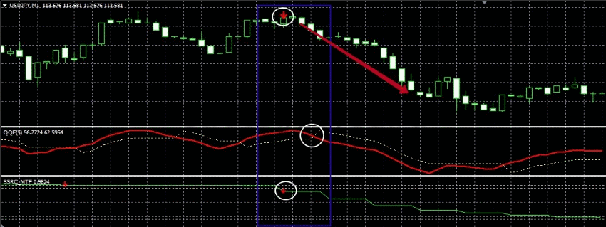 Индикаторы не обязательно должны давать сигналы одновременно. Обычно RSX запаздывает на 2–3 бара. Однако если через этот промежуток времени сигнал так и не подтвердился, сделку не открываем.