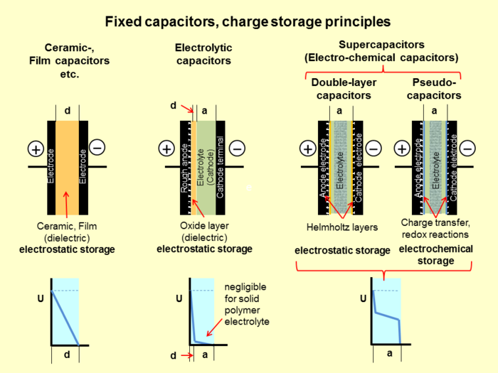 - Psuedo-конденсаторы, основаны на фагадическом процессе переноса заряда на поверхности электрода или вблизи него. В этом случае проводящие полимеры и оксиды переходных металлов остаются электрохимическими активными материалами,например, как в электронных часах на батарейках.