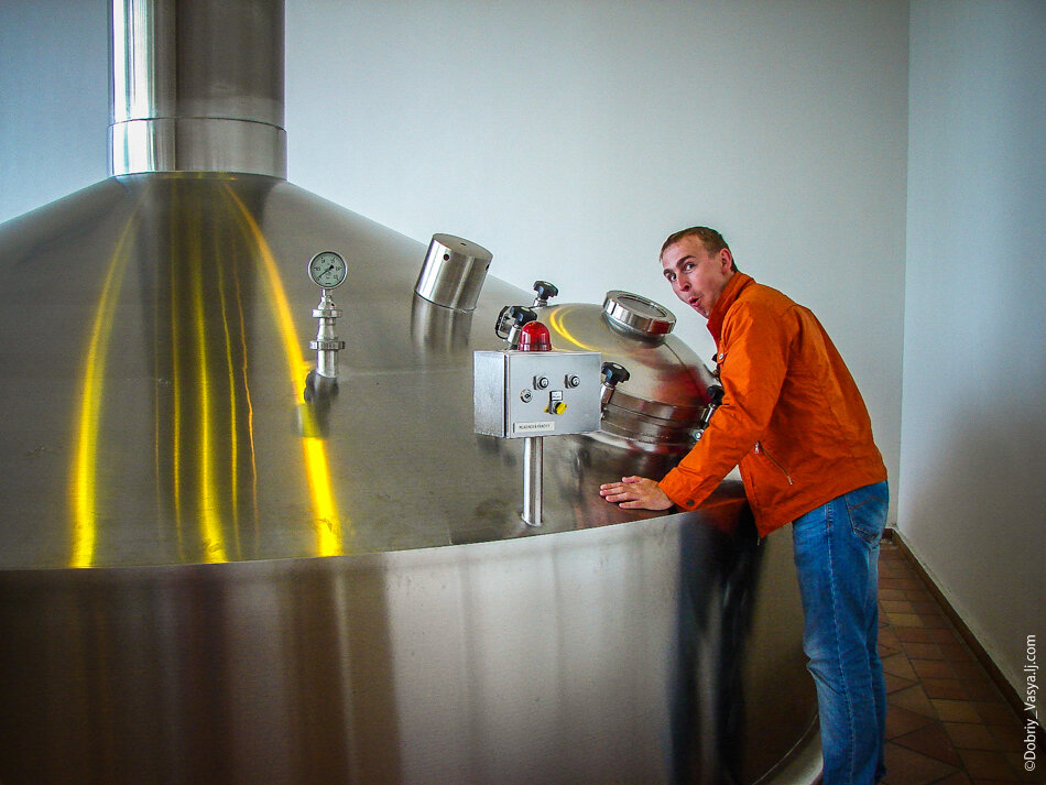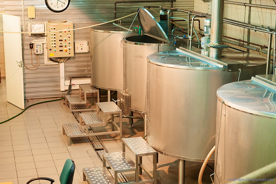09. Теперь перейдем в следующее отделение – цех брожения. Тут светло, тепло и очень чисто. Ровненькими рядами, как по линейке, стоят резервуары брожения.
