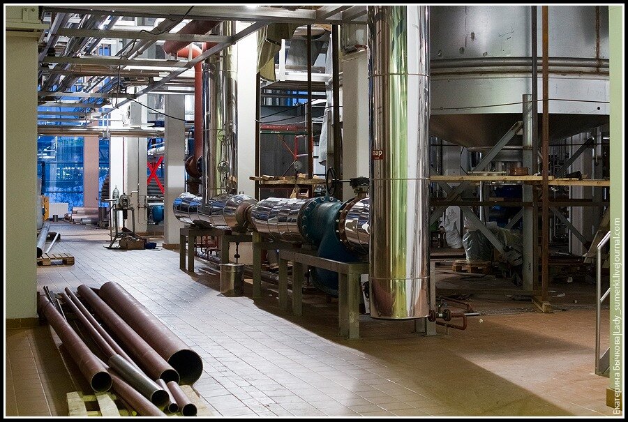 16. Обратите внимание, что резервуары не опутаны всевозможными трубопроводами закачки/перекачки и пр. Объясню почему. Дело в том, что пиво, как и любая другая пищевая жидкость, достаточно агрессивна к металлам, следовательно, с течением времени все трубопроводы покрываются участками микро коррозии и микротрещинами в которых очень хорошо живется всяким микроорганизмам. Да и к тому все эти сплетения трубопроводов требуют периодической промывки, что затратно, как по деньгам, так и по времени.