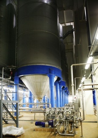 3. Брожение. Чистое сусло поступает через трубы на дно бродильных чанов, называемых цилиндроконическими танками. После того как жидкость остынет до нужной температуры, в чан добавляют дрожжи. Для пива верхового брожения перед добавлением дрожжей сусло охлаждают до 18-22°C, для пива низового брожения – до 5-10°C.