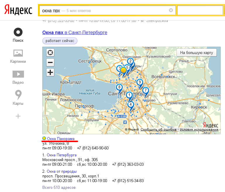 В первую очередь определяются организации, которые расположены близко к пользователю, и их координаты отображаются на карте Яндекса. Запросы, не требующие близости компании к дому пользователя, ранжируются по-другому.