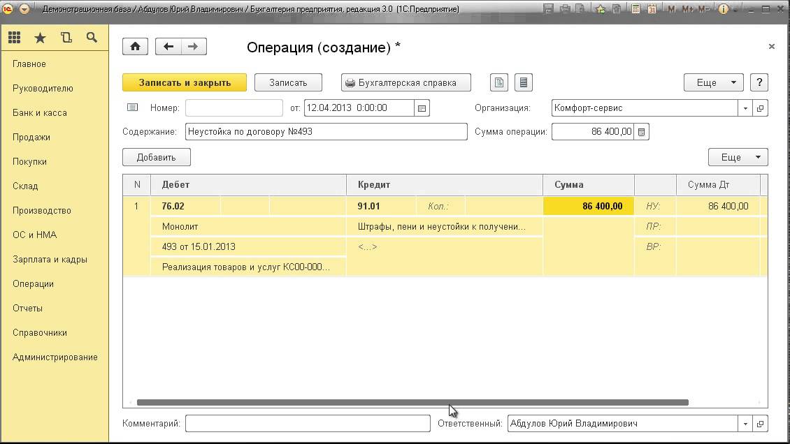 Для признания дохода по полученной неустойке (штрафу, пени) необходимо создать «Операцию, введенную вручную» (раздел «Операции» — Операции, введенные вручную – Создать «Операция»).