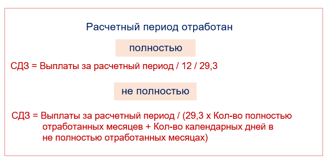 Для расчёта отпускных высчитывается средний дневной заработок — СДЗ. Эту сумму дохода за 1 год делят на 12 частей-месяцев и на 29,3. Последняя цифра отражает среднее количество дней в месяце. Полученную сумму умножают на количество дней отпуска.