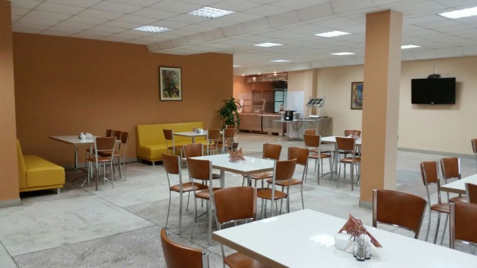 Кафетерий должен быть большим помещением с местом для подачи еды с одной стороны. Лучше всего держать еду по бокам комнаты, а столы и стулья в центре.