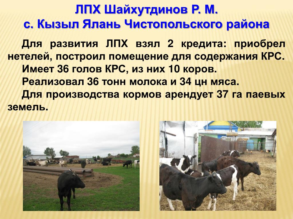 7. Откорм крупного рогатого скота — более продолжительная отдача, но менее затратная, чем по откорму свиней. Пастбищ очень много, сенокосов тоже. Начинать можно с небольшого поголовья. Лучше организовать семейную ферму на 10-15 коров или 15-20 бычков на откорм, с последующим переходом на механизированное обслуживание животных. Для решения проблемы реализации молока и мяса в районе будут созданы кооперативы. Первый будет создан в с. Якупово, так как там сегодня самое большое поголовье коров в личных подсобных хозяйствах.