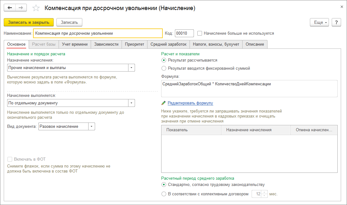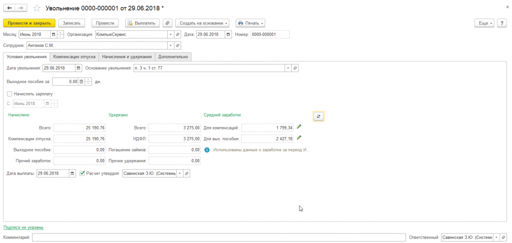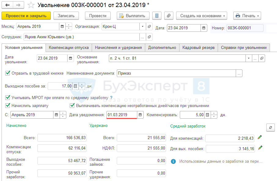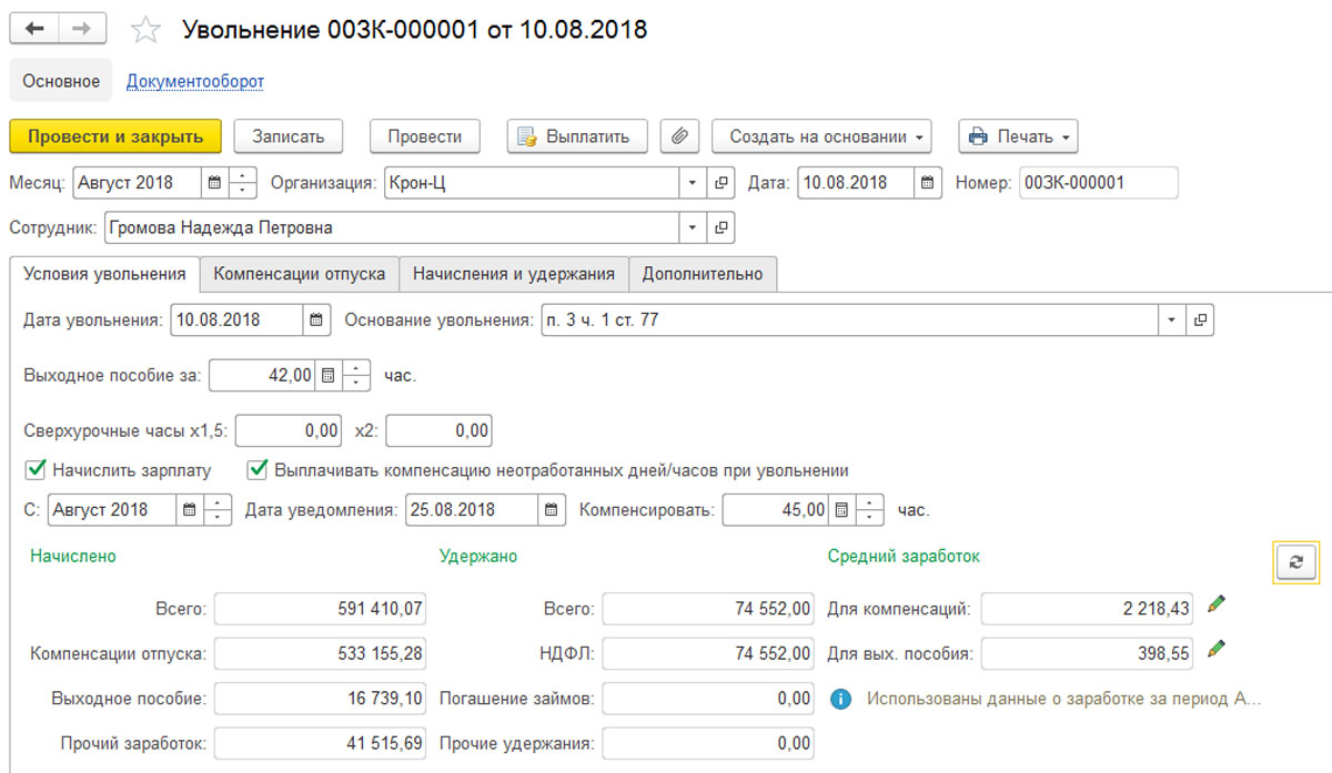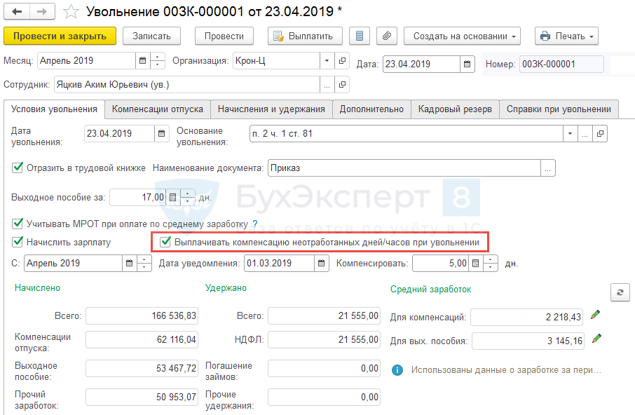 В документе нужно указать сотрудника и выбрать сформированный ранее кадровый документ в поле «Приказ». После этого дата увольнения и количество дней компенсации будут заполнены автоматически. В том случае, если предусмотрена выплата выходного пособия и заработка на время трудоустройства, необходимо указать количество дней, за которые будут рассчитаны начисления, в соответствующих полях формы.
