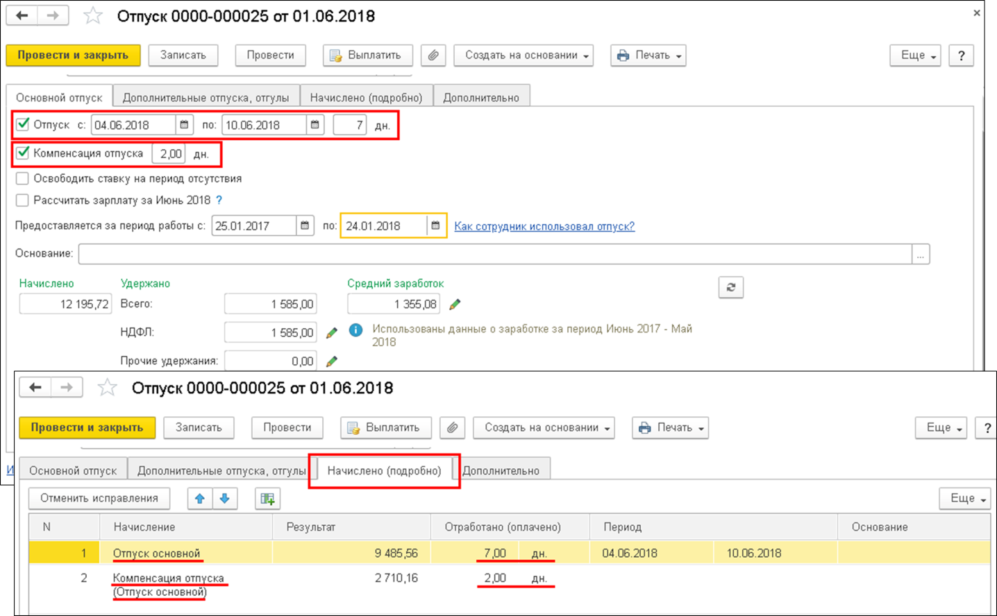А вот в том случае, если сотруднику положено не начисление компенсации отпуска, а наоборот, удержание за неотработанные дни, то есть два варианта отражения такого удержания.