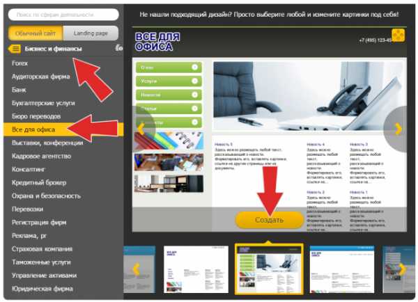 После нажатия на кнопку «Создать сайт» появляется страница, на которой выбирается тип сайта (обычный или Landing Page), затем рубрика и подрубрика, и дизайн. В меню слева дизайны распределены по наиболее популярным тематикам. Подобрав тип и дизайн, нужно кликнуть на кнопку «Создать».