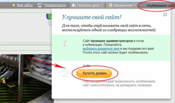 После нажатия кнопки «Опубликовать сайт», во всплывающем меню выбирается вариант «Купить домен».