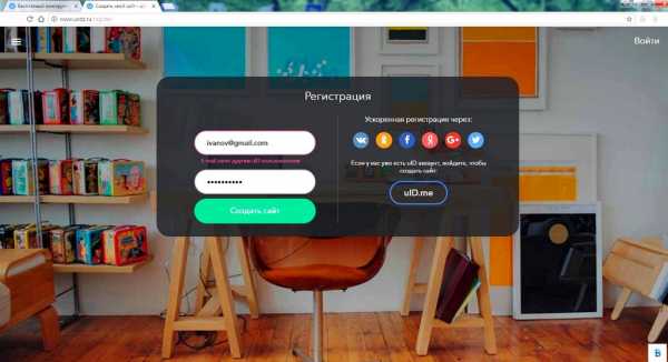 После нажатия на кнопку «Выберите домен» появляется поле для ввода доменного имени. Перед тем как имя присваивается сайту, оно проверяется на уникальность. Если имя свободно, то открывается форма регистрации владельца.