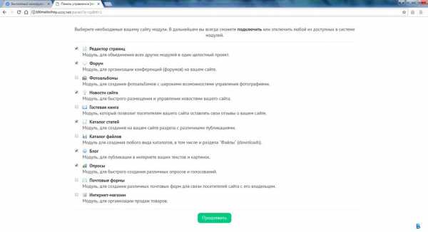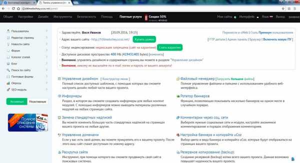Происходит переход к панели управления. В меню слева уже расположен весь набор модулей. Подключаем и отключаем их по необходимости, формируем конечный функционал своего сайта. Вначале нам доступно 400 Мб для размещения контента и объем увеличивается в зависимости от времени существования проекта и количества посетителей.