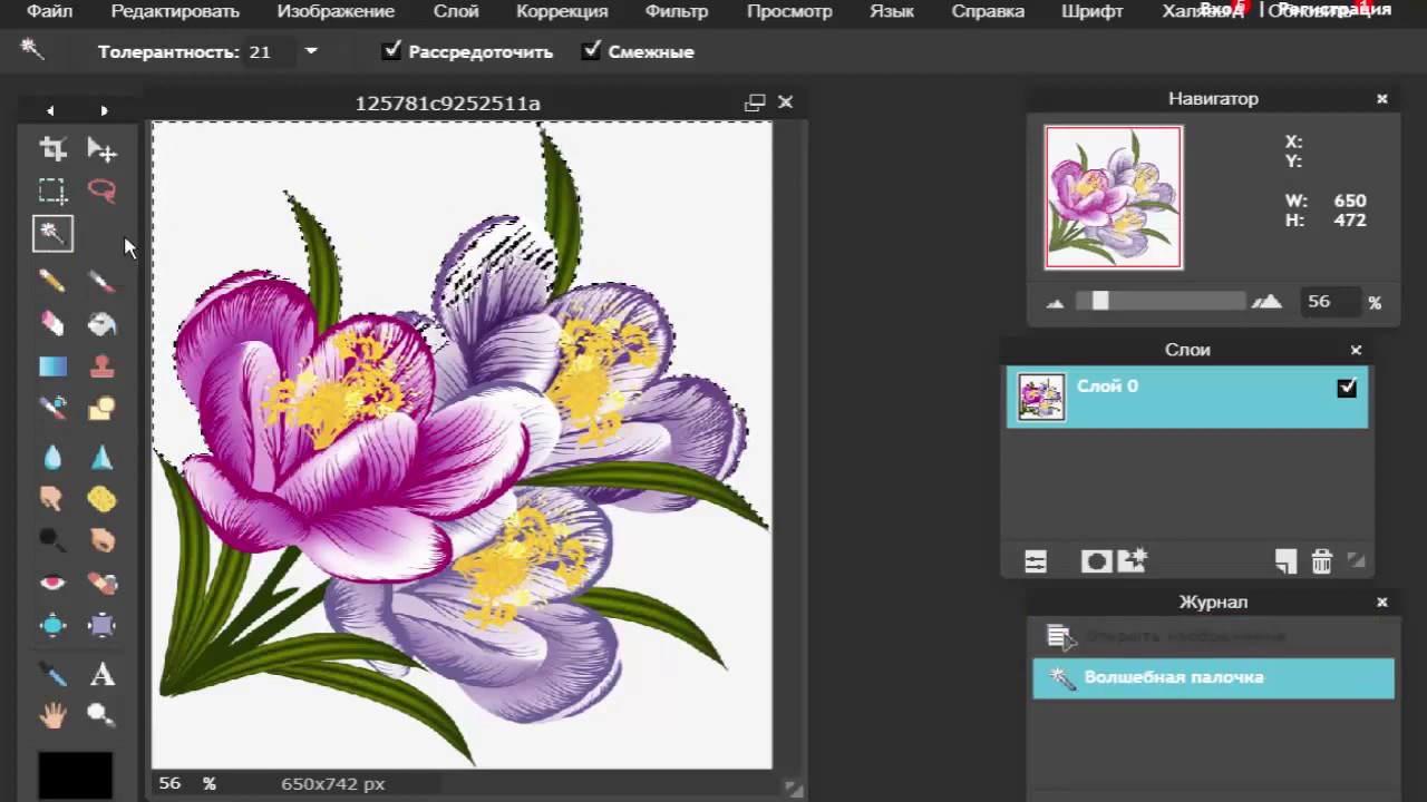 Теперь берем волшебную палочку (панель инструментов, правый столбец вторая кнопка сверху), указываем следующие параметры: допуск = 21, галочки стоят на сглаживании и непрерывности (обычно такие параметры стоят по стандарту), хотя с параметрами можете поэкспериментировать; и нажимаем на фон картинки (в нашем случае, на белый фон).