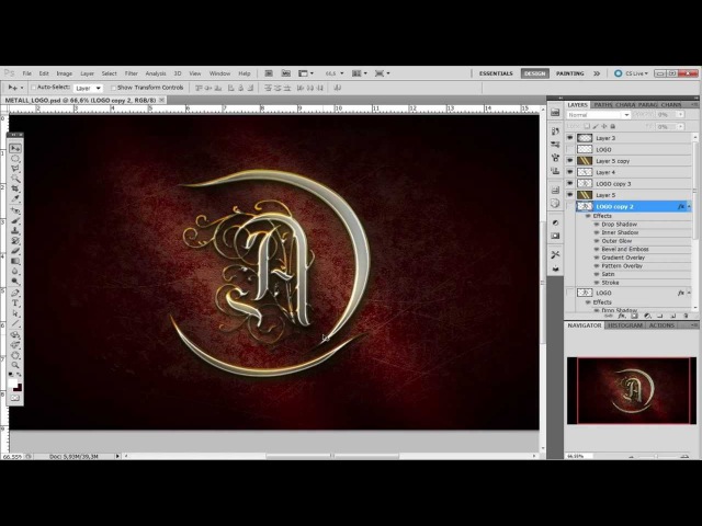 Для того, чтобы добавить к логотипу текстуру, я используюу другую металлическую текстуру. Откройте металлическую текстуру с царапинами, перенесите ее в дркумент и поместите поверх слоя с логотипом. Теперь, удерживая нажатой клавишу Ctrl, кликните по миниатюре слоя с логотипом, чтобы загрузить его выделение, затем перейдите на слой с металлической текстурой с царапинами (он находится над слоем с логотипом), инвертируйте выделение (Shift + Ctrl+ I) и нажмите Delete. Тем самым, текстура ляжет на логотип, а лишние ее части будут удалены.