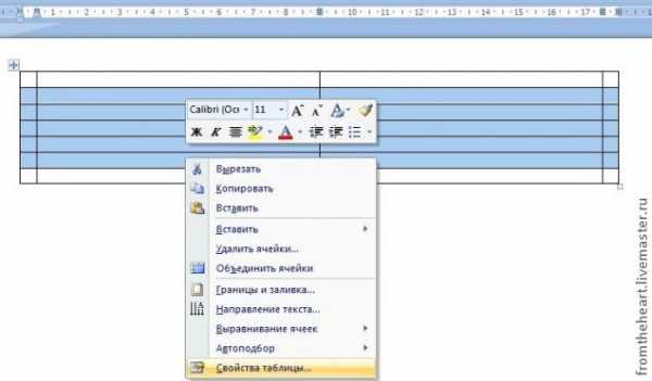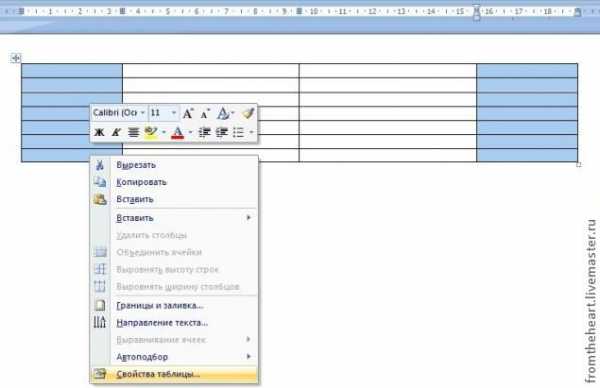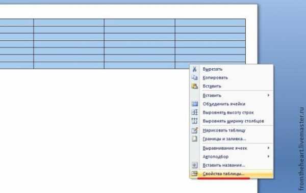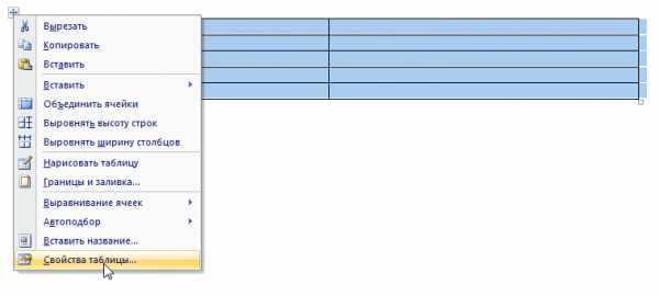 Напомню, что таблица создается через пункты “Вставка” –> “Таблица” – > выделяем нужное количество ячеек таблицы. - Выделите таблицу, кликните правой кнопкой мыши и выберите пункт “Свойства таблицы”