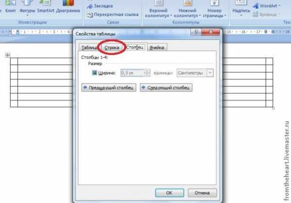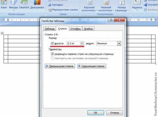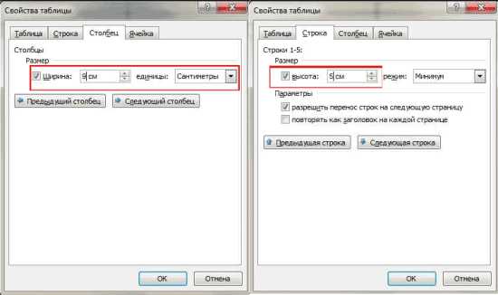 - В открывшемся окне войдите поочередно во вкладки “Строка” и “Столбец” и измените параметры высоты и ширины на 5 и 9 см соответственно. Смотрите скриншоты: