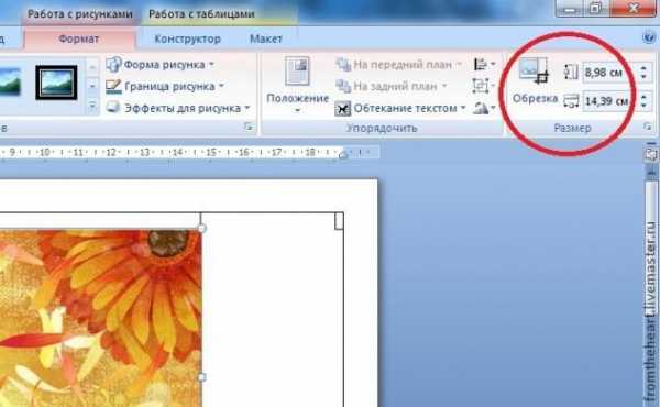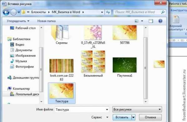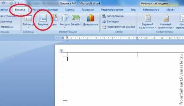 - Находим в интернете или рисуем для визитки – фон стандартного размера 9 на 5 см). Ставим курсор внутрь ячейки нашей таблицы и через команды “Вставка” –> “Рисунок” добавляем фон. Этот фон может получиться бОльшего размера и растянуть в стороны нашу ячейку. Это не проблема. В появившейся вкладке “Работа с рисунками” справа вы увидите настройку размеров изображения. Внесите изменения: