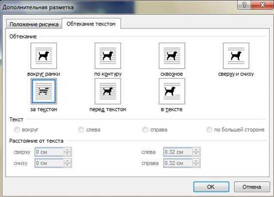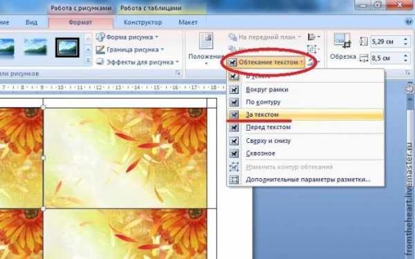 - Теперь сделаем нашу картинку фоном визитной карточки. Для этого в той же графе “Работа с рисунками” идем в пункт “Положение” –> “Дополнительно” и выбираем положение “за текстом”